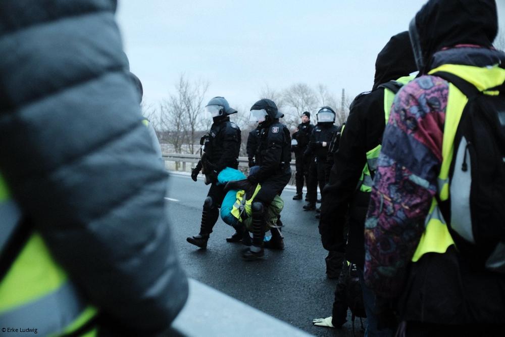 Obwohl die Blockaden gewaltfrei und friedlich organisiert wurden, kam es immer wieder zu massiver Polizeigewalt. Finn Grube: „Wir haben davon zum Glück nur wenig hautnah mitbekommen, aber Polizist*innen, die auf Demonstrierende einschlugen oder mit Pfefferspray ganze Gruppen einnebelten, waren das Thema des Tages unter den Blockierenden. Überall kursierten entsprechende Videos, Bilder und Nachrichten.“